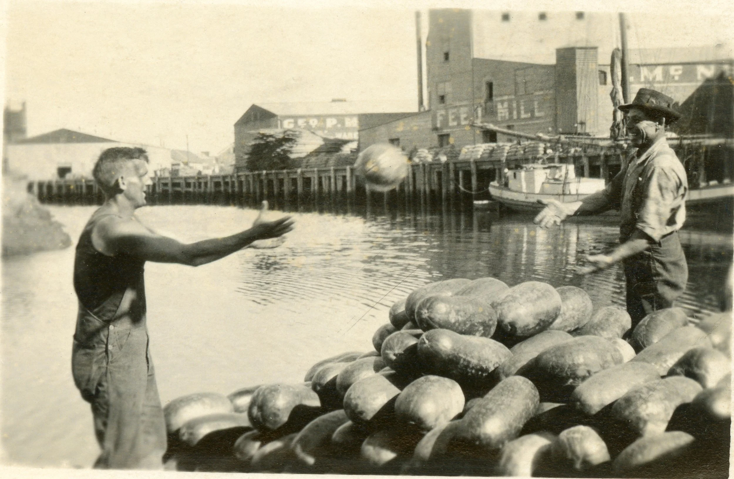 Clockwise from top left: The Pioneer Hatchery on Main Street (now called Petaluma Blvd.); Workers outside of the George P. McNear Feed Mill on the Petaluma River; Petaluma High School circa 1931; Marjorie Carpenter on the porch of her family's house in Petaluma. All images courtesy of Sonoma County Library Photograph Collection.